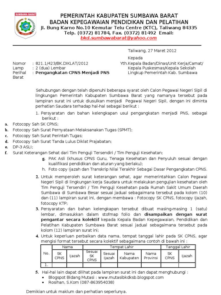 Semua rangkap 3 lembar dan diligalisir, untuk surat keterangan kehilangan dari kepolisian tidak perlu dilegalisir. Surat edaran kemenpan rb tertanggal 30 april 2019, nomor b/500/m.sm.01.00/2019 peraturan menpan rb tentang pengangkatan cpns menjadi pns tahun 2019 perihal cpns yang belum diangkat menjadi pns yang melewati batas waktu. Memiliki penilaian prestasi kerja yang baik dinyatakan secara. Contoh sk kepala dinas pendidikan untuk guru honorer info pendidikan terbaru. Tentang nomor bkn dan nomor sk cpns pns pengisian pupns.